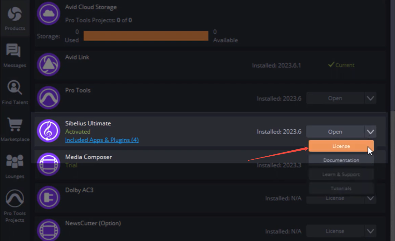 3. 单击 Open/Sibelius 右侧的下拉按钮,然后选择“License”。