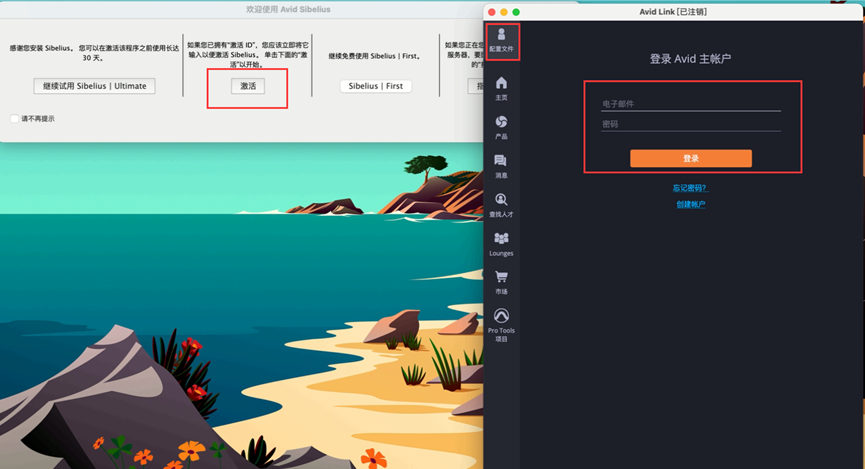 5.打开软件后点击“激活“后会打开Avid Link,点击配置文件,登陆注册的账号和密码即可激活