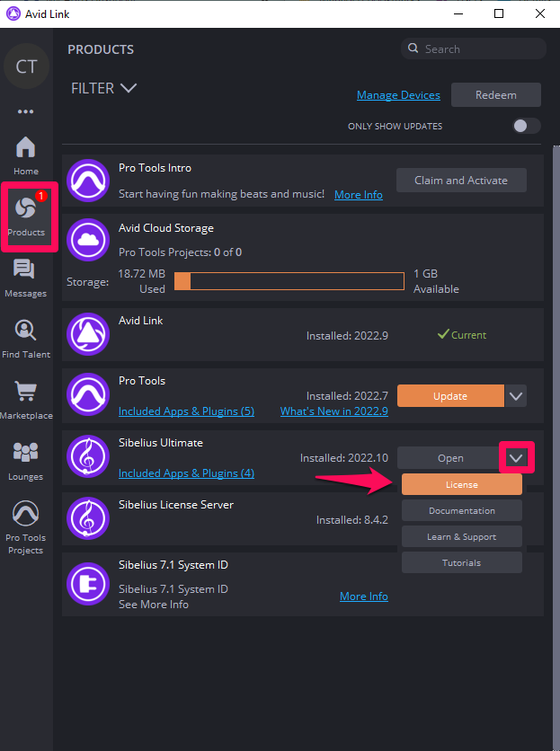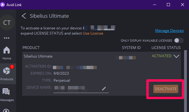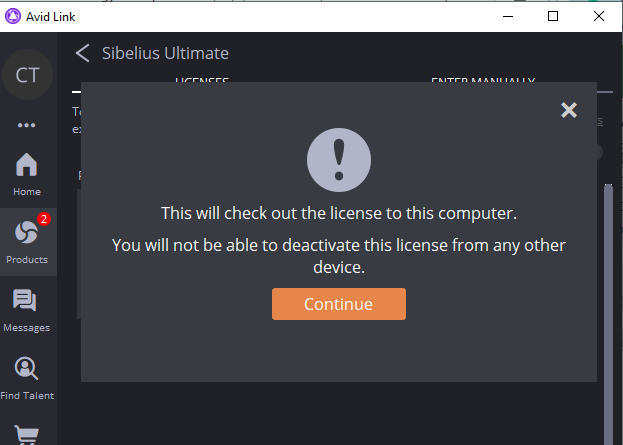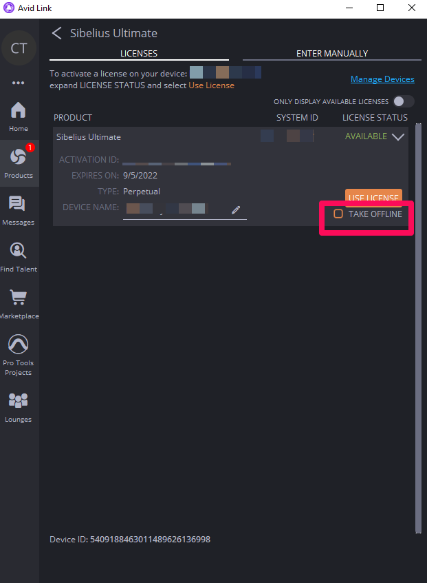 最新的Sibelius Cloud Licensing允许您离线使用许可证7天,但如果您想在internet上使用许可证更长时间,则可以选择将其离线使用。在Avid Link的许可页面(产品>Sibelius>许可下拉列表)上,您应该能够看到一个提示框,上面写着“TAKE OFFLINE”。